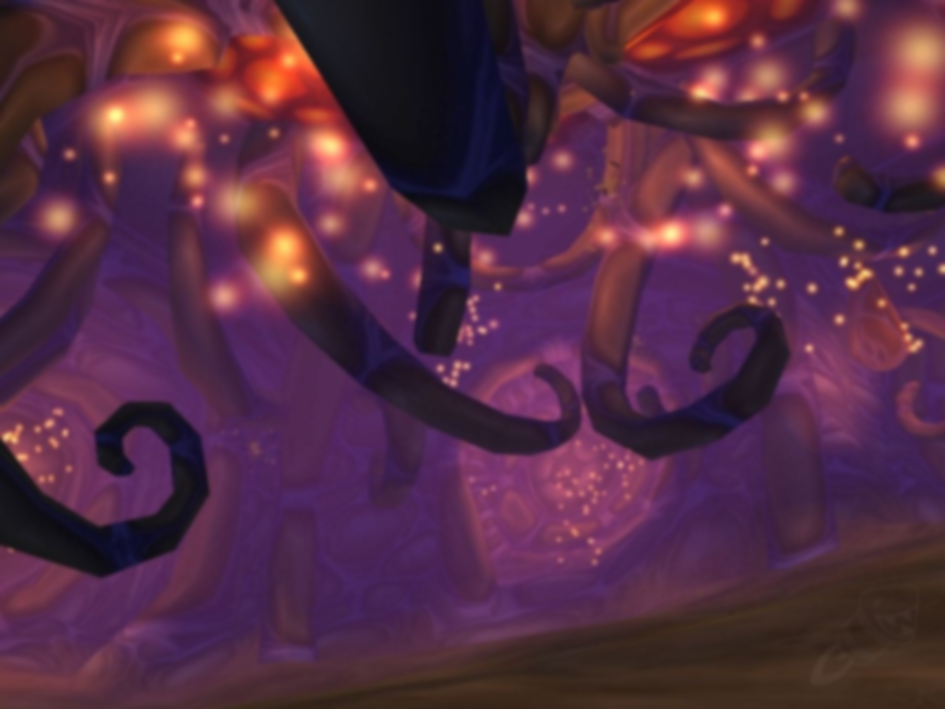 C'Thun is the final boss the Temple of Ahn'Qiraj. C'Thun is one of the five Old Gods, stripped of his full power by warring Titans. He fell to Azeroth, settling in the arid desert of Silithus, and slowly manipulated the native Silithid race into an army of his own image, the Qiraji. The great fortress city of Ahn'Qiraj was created to house their growing armies and prepare for the coming of C'Thun.